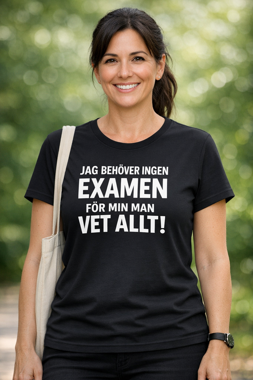 Rolig t-shirt: Jag behöver ingen examen – min man vet allt