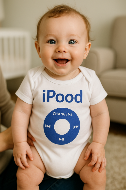 🎶 När låten är slut dyker texten upp: iPood CHANGE ME! Byt mig, snälla! 😄 Den här vita babybodyn med blått tryck efterliknar en mp3-spelare och har den ärligaste spellistan: från ”tyst larm” till storhiten som ropar efter en ny blöja. Sloganen iPood CHANGE ME säger allt innan dramat ens börjar – föräldrar, redo för insats?