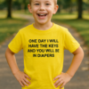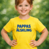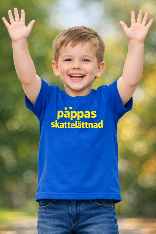 En klockren, svensk vardagshumor: barnet som pappas skattelättnad. Den blå färgen och den gula texten syns snyggt på bild och brukar garantera skratt på förskolan, lekplatsen och i familjealbumet.