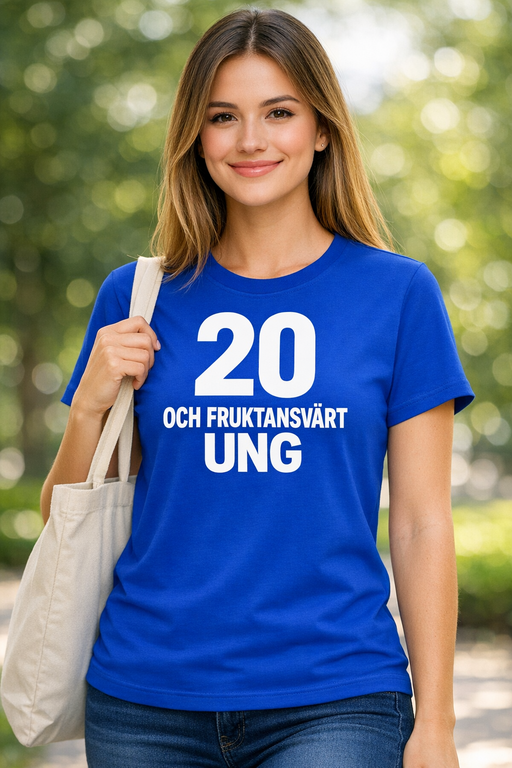 20 OCH FRUKTANSVÄRT UNG är den där självsäkra, skojiga statement-looken som gör dig till huvudpersonen på festen. Blå färg, vit text och max foto-vänlighet – redo för skål och skratt.