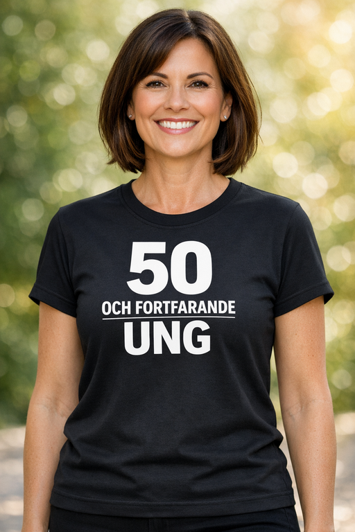 50? Bara en uppgradering. Den här svarta t-shirten med vit text gör budskapet glasklart: du är 50 och fortfarande ung – med humor, attityd och massor av energi.