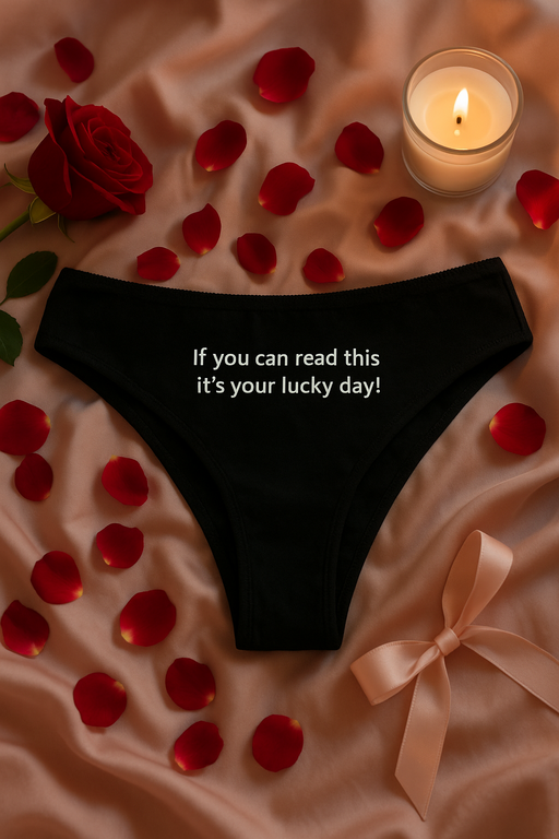 😉 Om hen kan läsa det… då är det verkligen hens lyckodag: If you can read this it’s your lucky day! Elegant svarta och farligt roliga – de här trosorna säger mer än tusen pikanta hintar. Tillräckligt kaxiga för att tända gnistor, men ändå så chic att du känner dig självsäker och lekfull. Leenden garanteras, upplösningen enligt ditt manus.