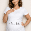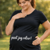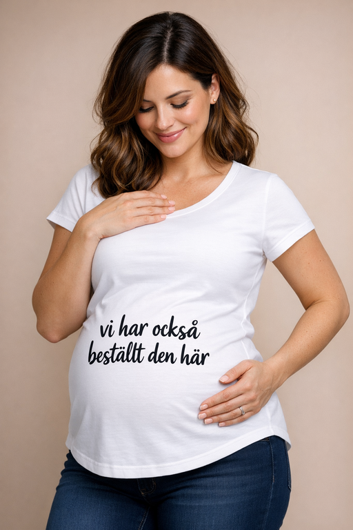 En ren, vit gravid-t-shirt med svart tryck som på ett roligt och varmt sätt berättar att en liten “leverans” är på väg. Sitter bekvämt över magen och gör budskapet tydligt utan att ta över.