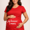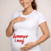En stilren svart gravid-t-shirt med vit text kommer i april – ett enkelt, snyggt och glädjefyllt sätt att dela ditt BF utan att behöva säga ett ord.