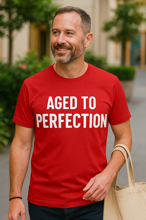 🍷✨ Röd T-shirt som säger det rakt ut: AGED TO PERFECTION — och du nickar självsäkert.