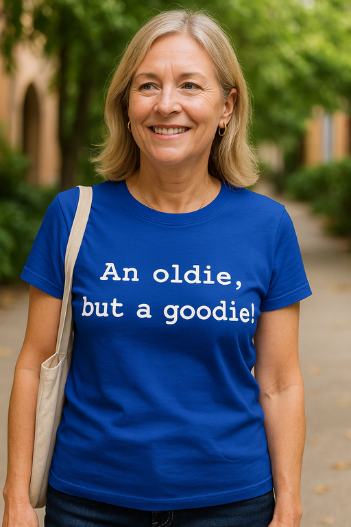 Blå kortärmad t-shirt med det legendariska trycket An oldie, but a goodie! – som din favoritlåt: funkar varje gång. För alla som adderar år med stil och humor och klär sig så att till och med Spotify känns analog.