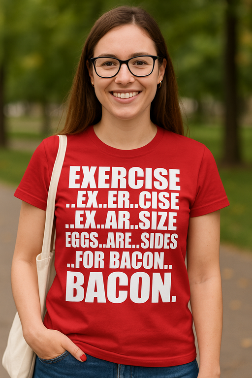 🥓 Cardio? Hellre bacondio! Den här röda bomulls-T-shirten med kaxig vit typografi och sloganen ’EXERCISE ..EX..ER..CISE ..EX..AR..SIZE EGGS..ARE..SIDES ..FOR BACON.. BACON.’ säger sanningen högt och tydligt.