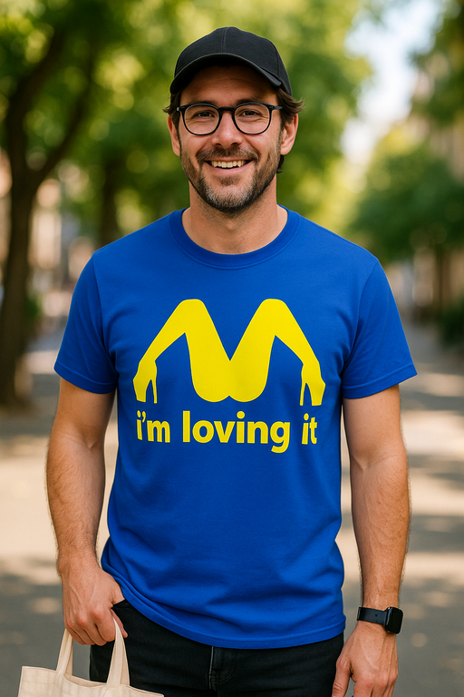 🍟 När benen formar ett M ropar din outfit: I’m loving it! Den här blå kortärmade T-shirten med ett gult grafiskt M skapat av kvinnoben i klackar är receptet på ett instant leende. Du tar på den och folk vet inte om de ska applådera eller beställa en extra portion skämt.