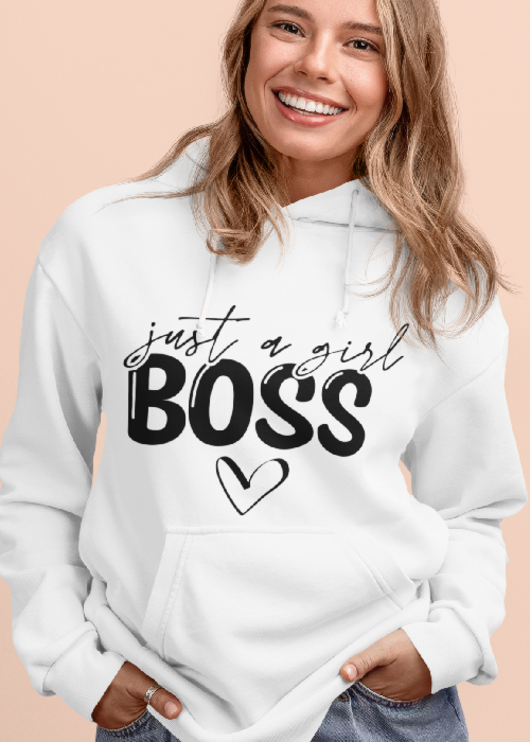 Kliv in som chefen och ta med dig komforten: huva, dragsnören och framficka. Texten just a girl BOSS visar vem som leder teamet (och vem som blir uppringd när råd behövs). Den här tröjan är som ett pepp-talk, bara mycket mer bärbar och helt utan PowerPoint.