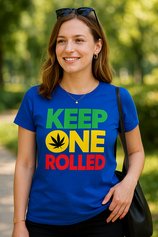 🌿😎 Blå kortärmad T-shirt + stort tryck KEEP ONE ROLLED = du håller dig cool och världen blir roligare. Färgglada bokstäver och ett litet blad i O:et berättar en lagom busig historia – till och med vakten vid festivalentrén drar på smilbanden.