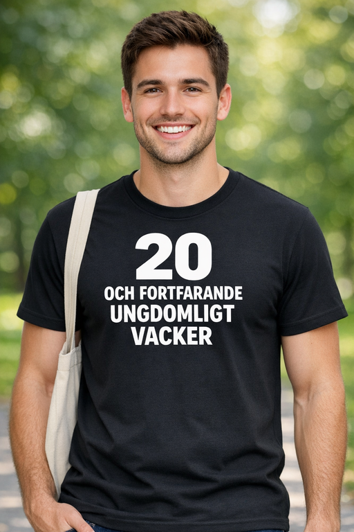 20 är nya 18. Den här svarta t-shirten med trycket 20 OCH FORTFARANDE UNGDOMLIGT VACKER är perfekt för födelsedagsbarnet och alla som vägrar bli tråkiga.