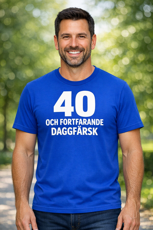 Fyller du 40 och vägrar bli ”vuxen på riktigt”? Med den här blå t-shirten och den kaxiga texten 40 OCH FORTFARANDE DAGGFÄRSK kliver du in på festen som beviset på att ålder bara är en siffra.