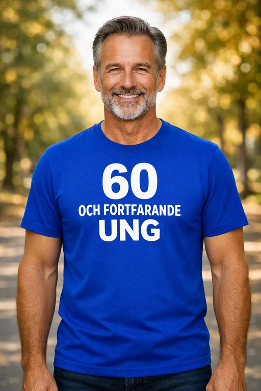 60 OCH FORTFARANDE UNG säger allt – en kaxig, rolig statement-tee som visar att ålder bara är en siffra och energin är kvar.