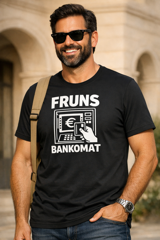 En klockren snackis i svart med tydligt tryck: FRUNS BANKOMAT och en hand som ”tar ut” euro — perfekt humor för brudgummen som bjuder på sig själv och vill äga festen (och notan).