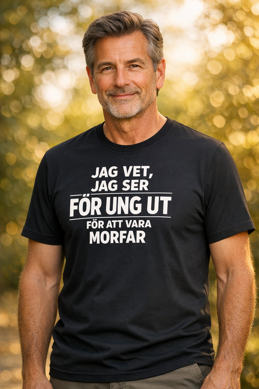 En kaxigt rolig statement-tröja för dig som rockar morfarstiteln med ungdomlig stil – och gärna påminner om det med ”JAG VET, JAG SER FÖR UNG UT FÖR ATT VARA MORFAR”.