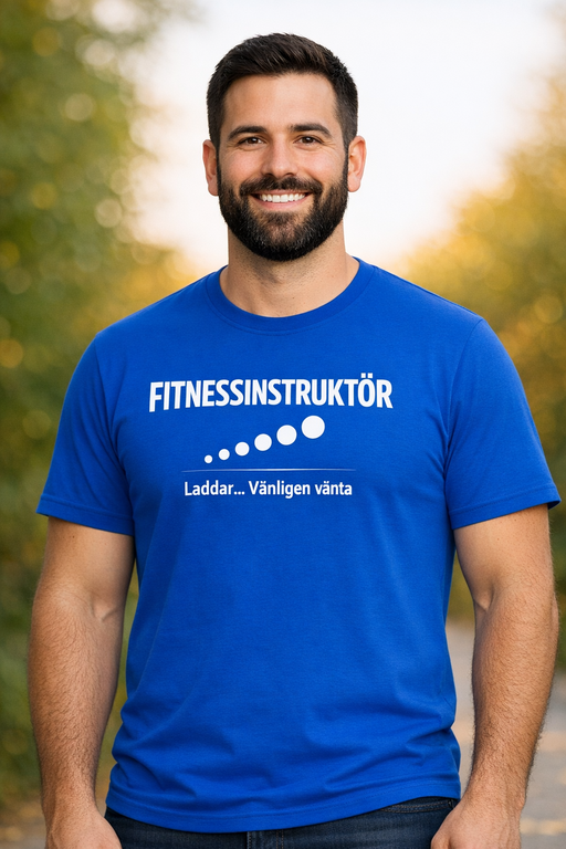 När passet precis ska dra igång säger trycket allt: FITNESSINSTRUKTÖR – Laddar… Vänligen vänta. En klockren mix av träningsfeeling och tech-humor som funkar lika bra på gymgolvet som på väg till nästa pass.