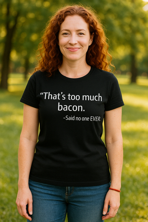 🥓 Denna svarta T-shirt med korta ärmar bär den ultimata sanningen: That’s too much bacon. – Said no one EVER. 😎 När orden doftar bacon är det bara leendet som återstår. Perfekt för dig som mäter lycka i krispiga skivor och tycker att sallad mest är sällskap.