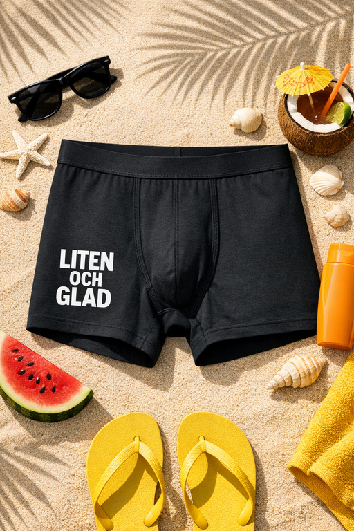 Okej, det här är inga t-shirts – men samma känsla: en kaxig, självsäker statement-grej. Den vita texten LITEN OCH GLAD på svart tyg är enkel, tydlig och precis lagom fräck för att höja stämningen.
