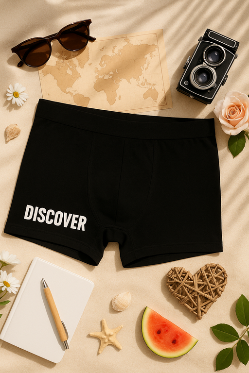 🧭 Vem säger att äventyret inte börjar i lådan? Säg bara: DISCOVER! Svarta boxerkalsonger med text på vänster ben bjuder in dig att upptäcka komfort, självförtroende och en nypa bus.