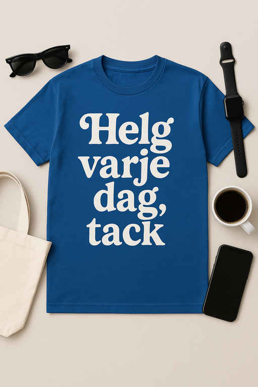 Varje dag borde kännas som en fredag, eller hur? Med vår ikoniska T-shirt ’Helg Varje Dag, Tack’ sprider du weekend-vibbar vart du än går. Tillverkad i mjuk, högkvalitativ bomull som känns lika bekväm som en sovmorgon. Perfekt för lata söndagar, AW:s på en tisdag, eller bara när du vill signalera att du lever för livet – inte för jobbet. En humoristisk och stilren statement-tröja för alla helgfantaster där ute.