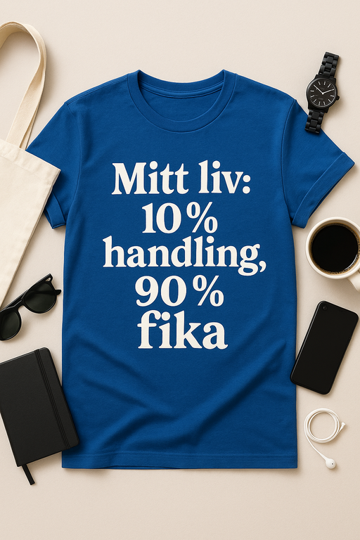 Visa världen dina sanna prioriteringar med vår humoristiska T-shirt: ’Mitt liv: 10 % handling, 90 % fika’. Tillverkad i mjuk och skön bomull som tål både jobbet och kaffefläckar. Perfekt för skriverbordskrigare, soffpotatisar och kanelbullskonnessörer som vet att livet smakar bäst med socker på. Bär den stolt – din kaffekopp kommer tacka dig!